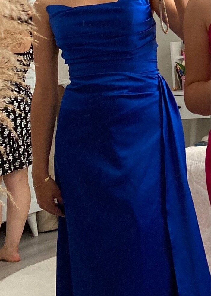 Saten degaje görünümlü straplez yırtmaçlı kuyruklu harikaaaa bir abiye