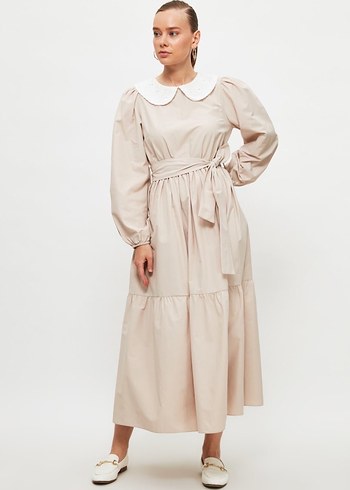 Yüksek yakalı, uzun kollu, nakışlı detaylara sahip uzun lacivert kadın elbisesi.