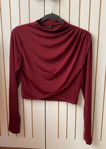 Bordo renkte, drapeli V yaka ve uzun kollu, sentetik kumaştan yapılmış, günlük kullanıma uygun dar kesim bluz.